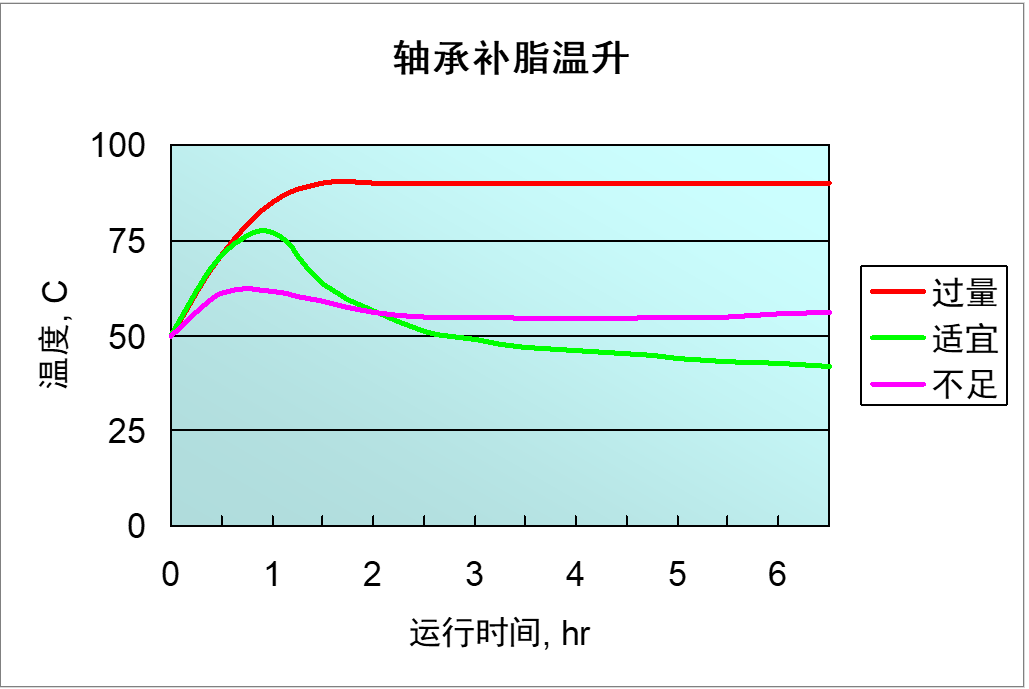 這個圖表可能用于分析和比較不同潤滑油脂添加量對軸承運行溫度的影響,以確定恰當?shù)募又?,確保軸承運行效率和壽命。