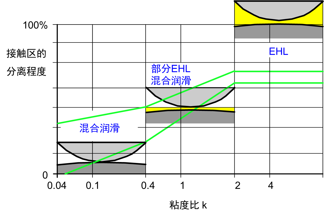 這張圖表展示的是粘度比 ( k ) 與軸承潤滑狀態(tài)的關系。粘度比 ( k ) 是指在給定工作條件下潤滑油的實際粘度與軸承所需的最低設計粘度之比。此圖主要描述不同的 ( k ) 值如何影響軸承的潤滑效果,包括邊界潤滑、混合潤滑和彈流潤滑(EHL,Elastohydrodynamic Lubrication)。