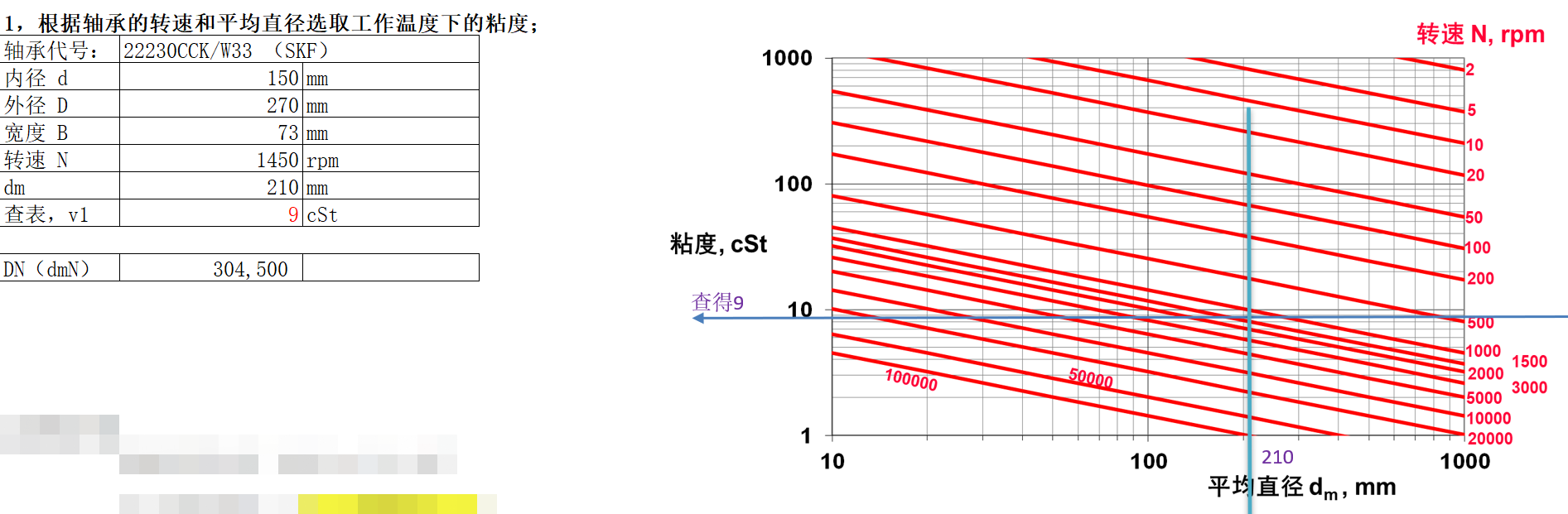 為了測定基礎油粘度,使用標準操作條件下的平均軸承直徑dm(單位:[mm])、軸承轉(zhuǎn)速和軸承溫度。所示圖表在工作溫度下所需的基礎油粘度=9 mm2/s。